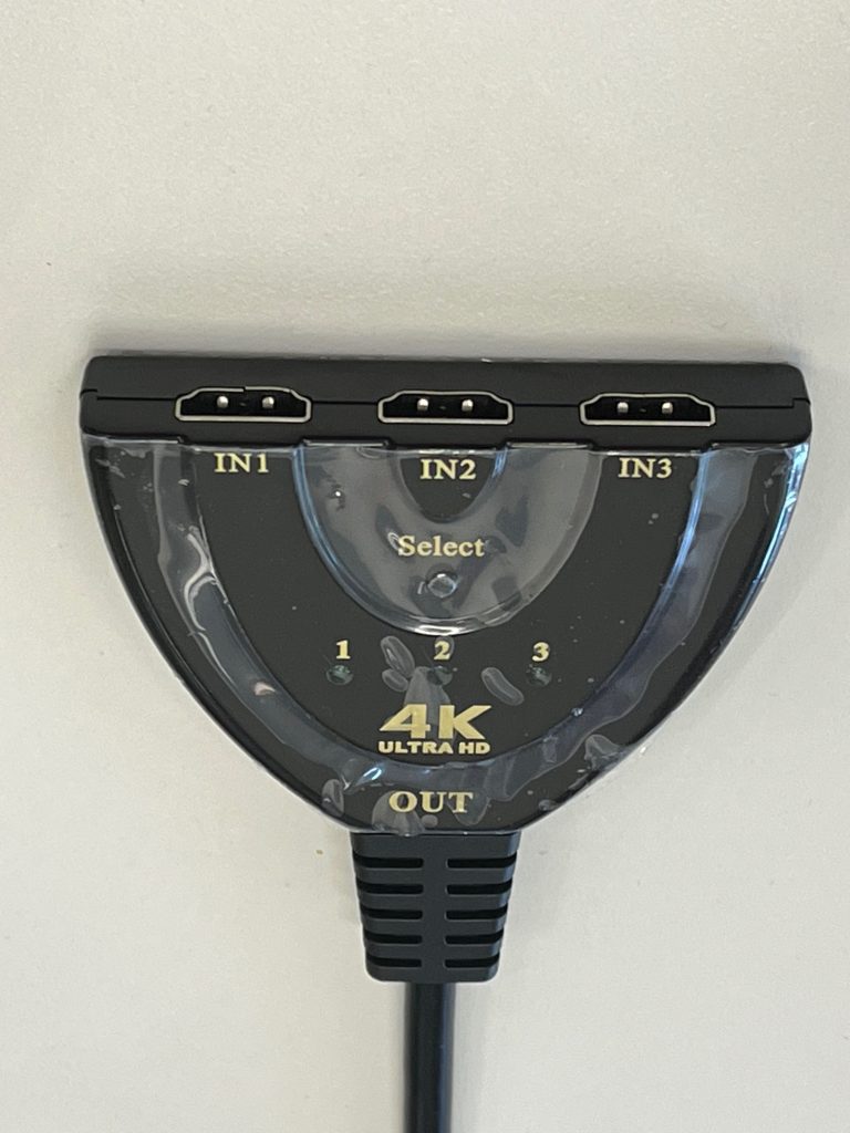 A les aules informàtiques de l’EPS, estem desplegant un selector HDMI (veure imatge) que us permetrà connectar-hi la sortida de vídeo del vostre portàtil, i que aquesta s’enviï directament al projector, sense que intervingui el PC de l’aula (del professor).